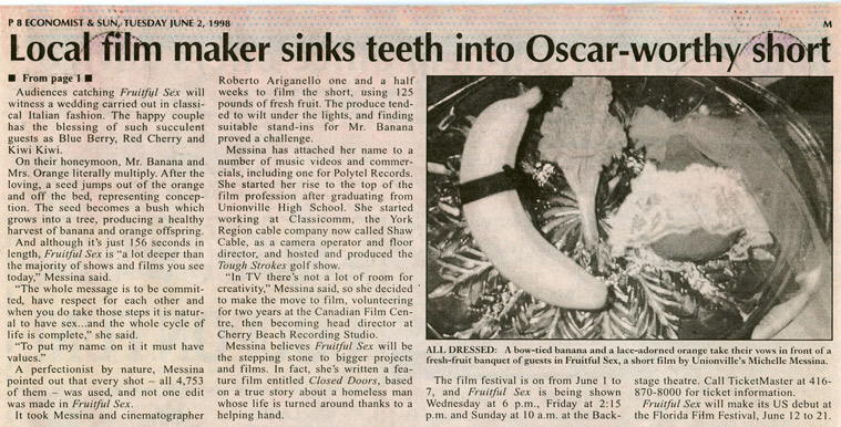 Economist & Sun Journalist: Julie Caspersen Article: Fruitful Sex a cinematic feast (Front Page & two pages) Tues. June 2, 1998